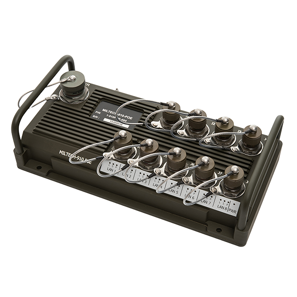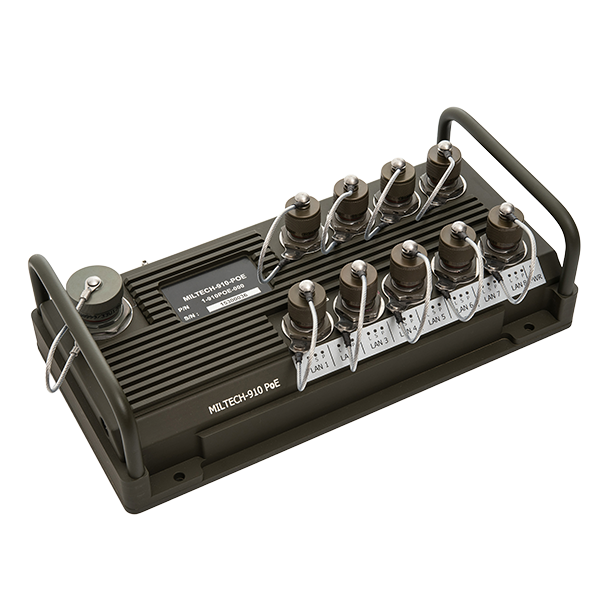 The MILTECH 910-POE's intelligent design allows it to be configured to support up to 60W of PoE on any port up to a maximum power budget of 330 watts in total. It supports both 802.3af and 802.3at standard devices for PoE-enabled cameras, Wi-Fi access points, tactical IP phones, mesh nodes and other devices.
